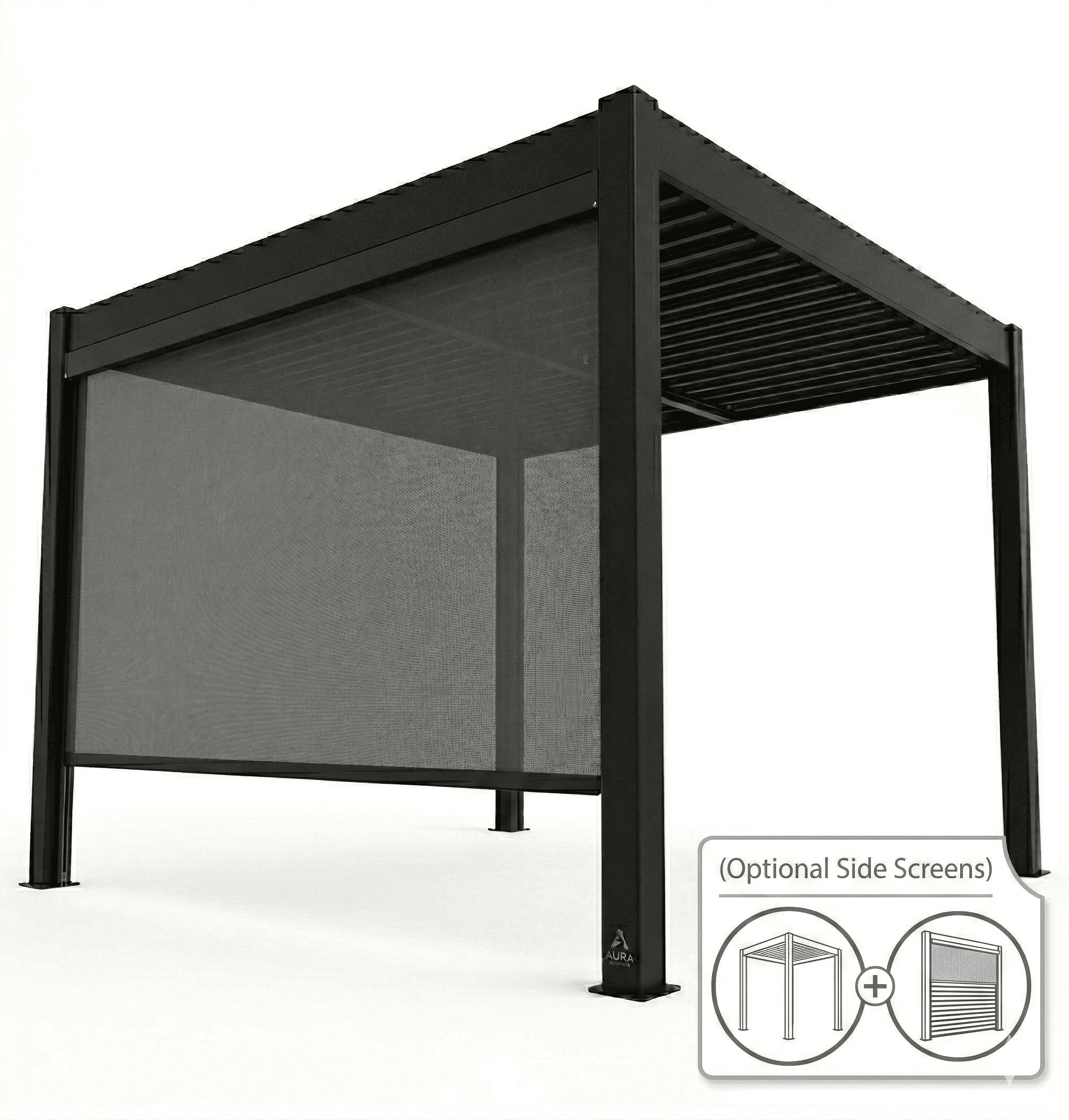 Side screens are an optional feature that can be added to your pergola for extra shade, privacy, and protection from wind and insects. They enhance comfort and allow you to enjoy your outdoor space in more weather conditions.