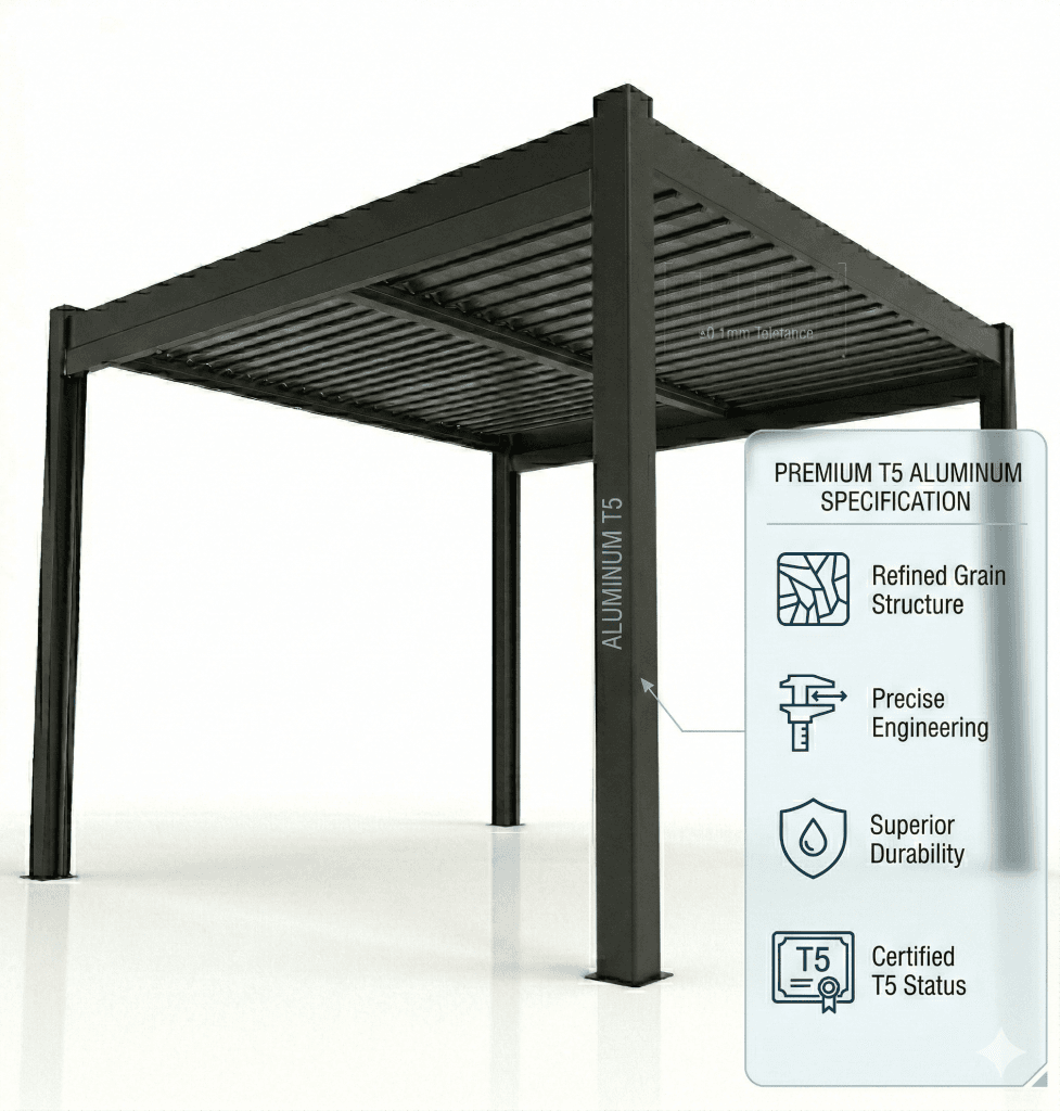 Our pergolas are built from high-quality T5 aluminum, a strong and lightweight material known for its durability and resistance to rust. This ensures a sturdy structure that can withstand outdoor conditions while maintaining a clean, modern look for years to come.